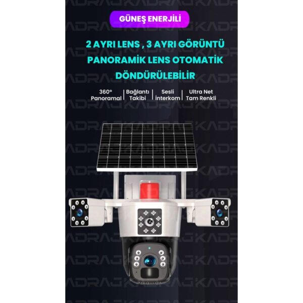 Kadraj Solar Güvenlik Kamerası Güneş Panelli Çift Lensli 4g Sim Kart Destekli 10.000 Mah Batarya 6 mp Full Hd Görüntü Kalitesi