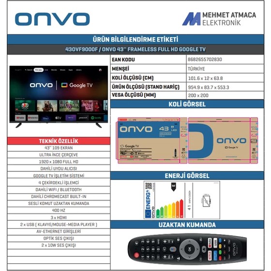 Onvo 43OVF9000F 43” 109 Ekran Uydu Alıcılı Full HD Google LED TV
