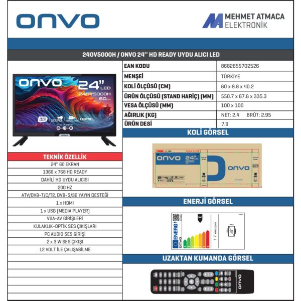 Onvo 24OV5000H 24” 60 Ekran Dahili Uydu Alıcılı HD Ready LED TV (12V)