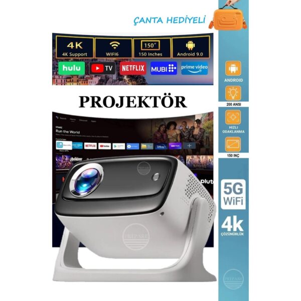 Prepare 4K Ultra Hd Mini Seyahat Projektörü Ev Ofis Toplantı Sunum Sinema Oyun Tripotlu HDMI Bluetooth Wifi