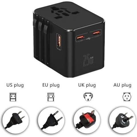 25W Şarj Cihazı ve 1x USB ve 2x Type-C Girişli Universal Seyahat Adaptörü, Priz Dönüştürücü 200’DEN Fazla Ülke ile Uyumlu, Abd, Ingiltere, Aus, Ab
