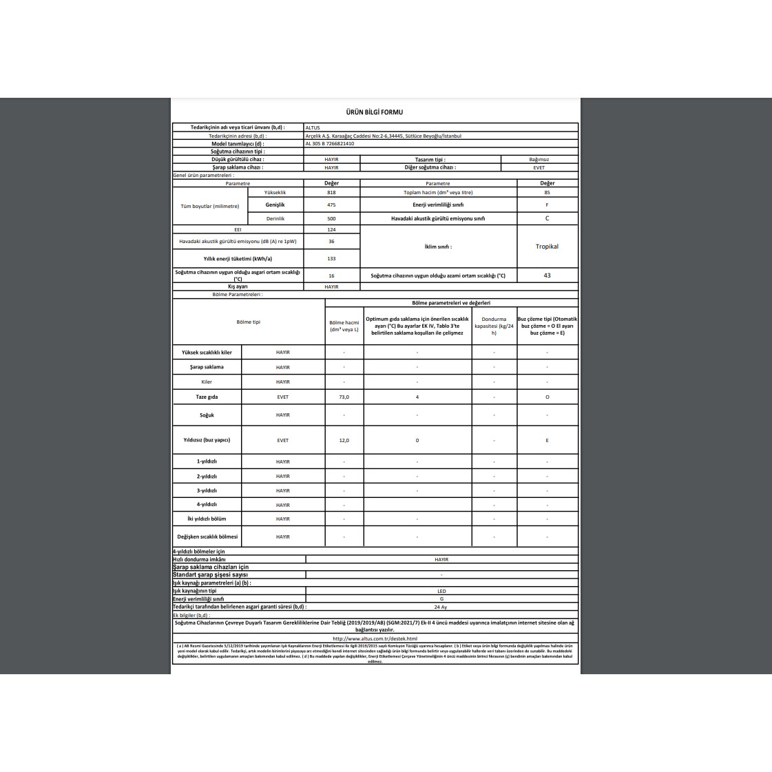 Altus Al 305 Be E Enerji Sınıfı 85 L Tezgah Seviyesi Buzdolabı Beyaz
