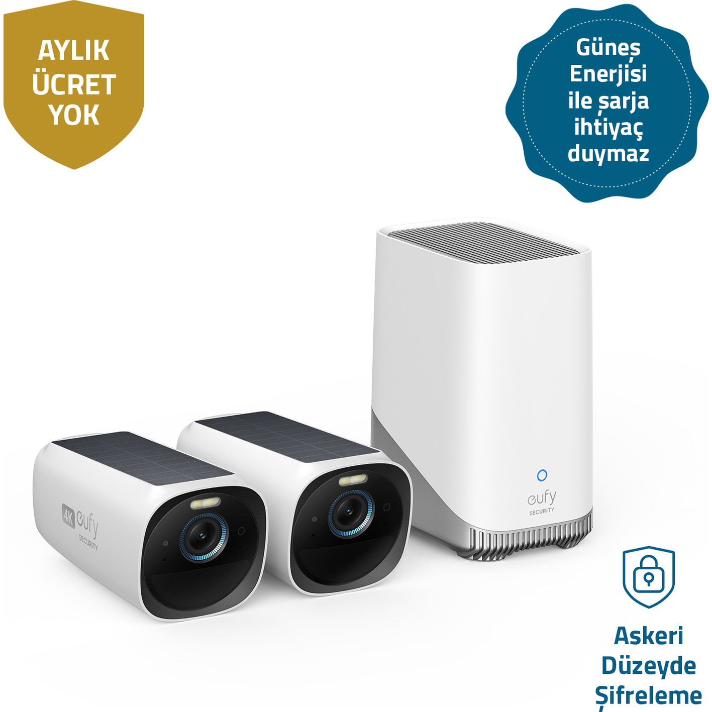 Anker Eufy Security Eufycam 3 Kablosuz Akıllı Güvenlik ve 4K Kamera Sistemi, evinizin veya işyerinizin güvenliğini sağlamak için tasarlanmış bir üründür. Bu sistem, 2 adet kablosuz kamera ve 1 adet ana üniteden oluşmaktadır.