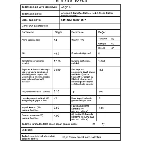 Arçelik 6444 Ok I D Enerji Sınıfı 4 Programlı Bulaşık Makinesi için 4 değerlendirme