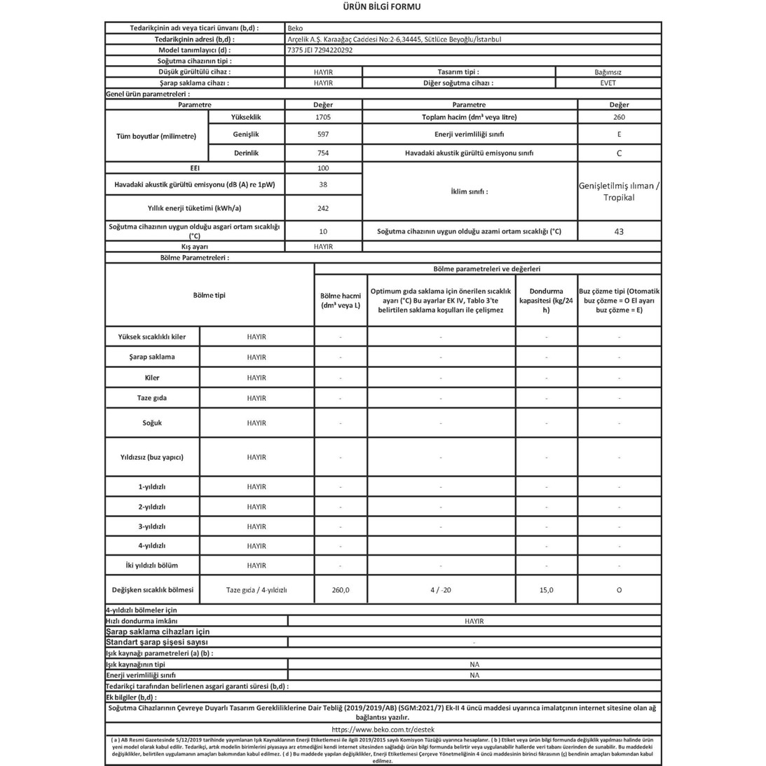 BEKO 7375 Jeı E Enerji Sınıfı 260 lt No Frost Derin Dondurucu