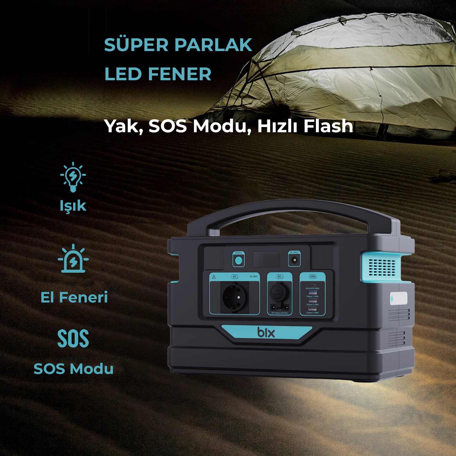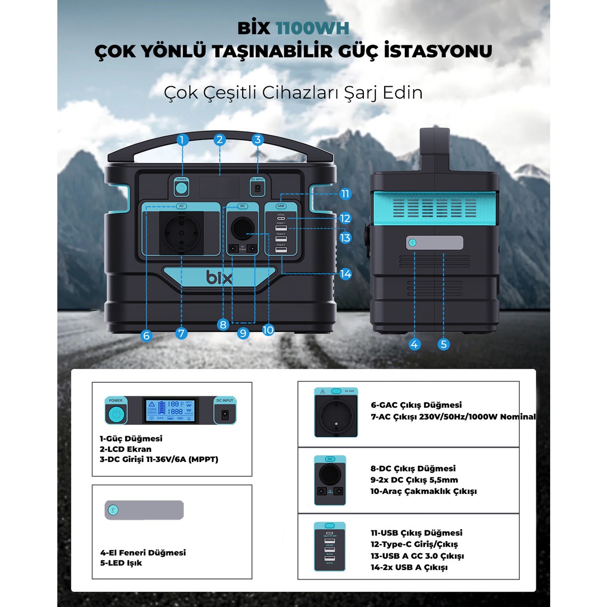 Bix PS300K, 300.000mAh kapasiteye sahip, 1110WH enerji depolama kapasitesi olan, 1000W AC priz, 3 adet USB-A ve 1 adet 100W Type-C giriş ve çıkış özelliklerine sahip hızlı şarj teknolojili taşınabilir şarj cihazıdır. Bu güç istasyonu, birçok cihazı aynı anda şarj etme imkanı sunar ve yüksek güç gerektiren cihazları da destekler. Taşınabilir olması sayesinde seyahatlerde, kamp yaparken veya acil durumlarda kullanım için ideal bir üründür. Güvenilir ve dayanıklı malzemelerden üretilmiş olan Bix PS300K, uzun ömürlü ve güvenli bir kullanım sunar.