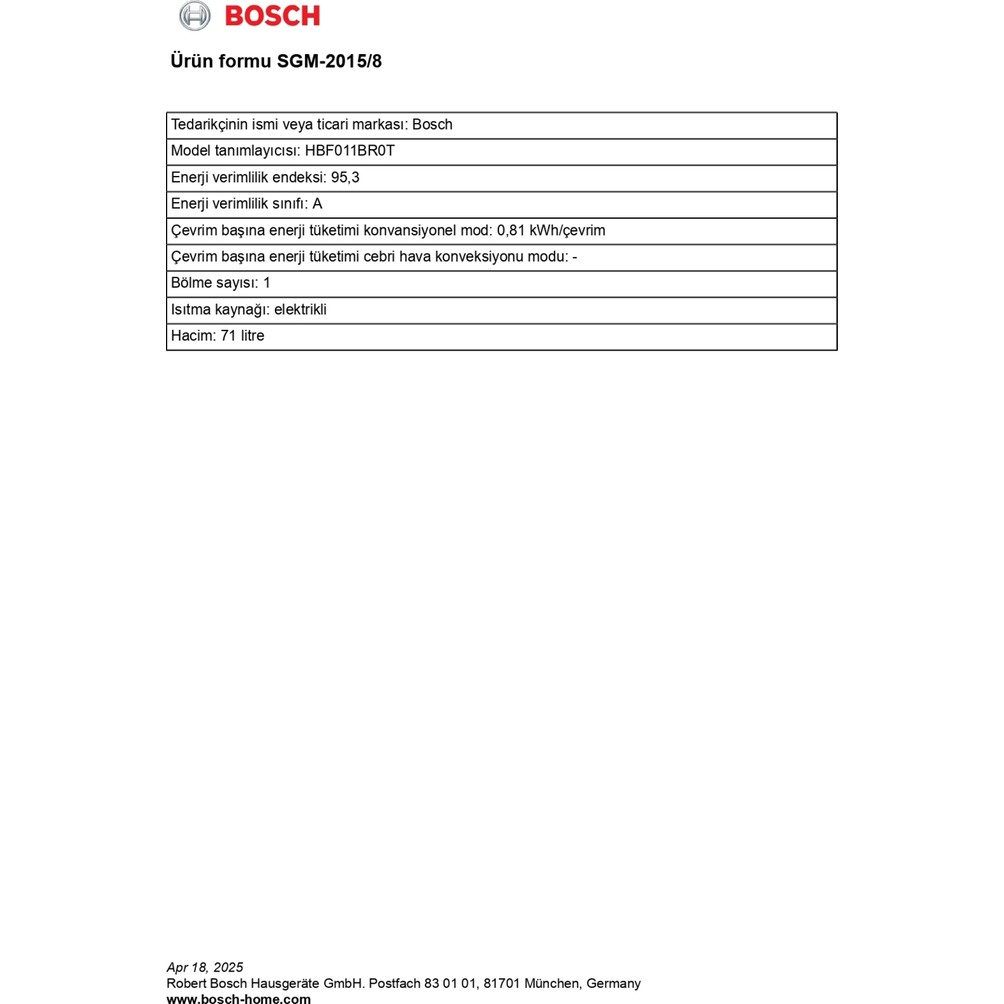 Bosch HBF011BR0T 71 Lt 4 Programlı Inox Ankastre Fırın