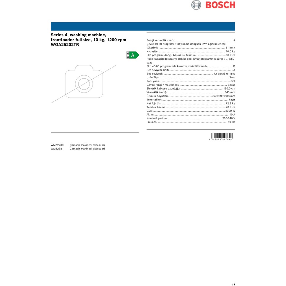 Bosch WGA25202TR Serie 4 Çamaşır Makinesi 10 kg 1200 Dev./dak. A Beyaz