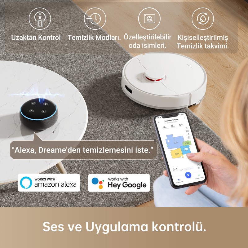 Bu robot süpürge, Wi-Fi bağlantısı ile akıllı telefonunuzdan veya tabletinizden kontrol edilebilir. Uygulama üzerinden programlanabilir ve uzaktan kontrol edilebilir. Ayrıca sesli komutlarla da yönlendirilebilir.