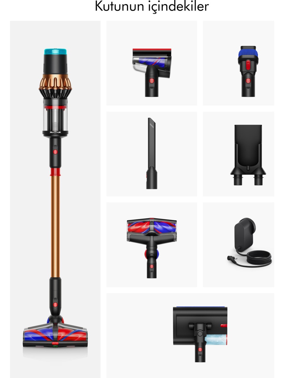 Dyson V16 Piston Animal Submarine™ ıslak kuru kablosuz süpürgemizin kutu içeriğinde; Tüm zeminleri algılayan konik temizleme başlığı, Submarine™ 2.0 ıslak temizleme başlığı, Anti-tangle Mini Motorhead 2.0, Kombinasyon başlığı, Aralık temizleme başlığı, Duvar askı ünitesi ve şarj aleti bulunmaktadır.