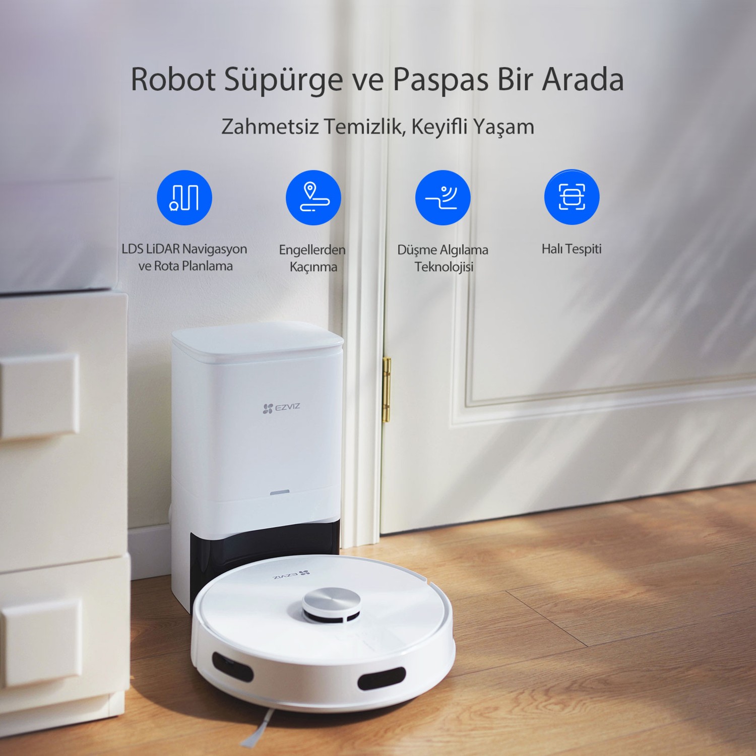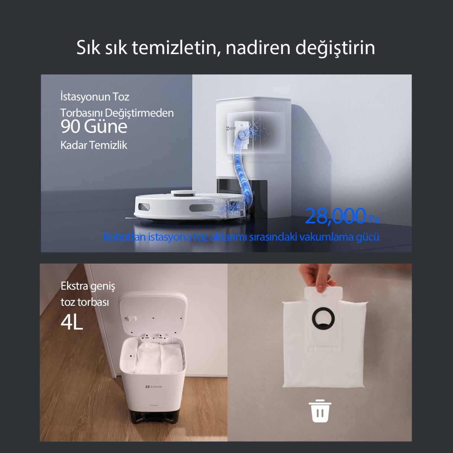 Ezviz RE4 Plus Akıllı Robot Süpürge, Paspas ve Süpürme, Otomatik Toz Boşaltma, Extra Büyük 4Lt Toz Torbası, Halı Tanıma (Ezviz Türkiye Garantili)