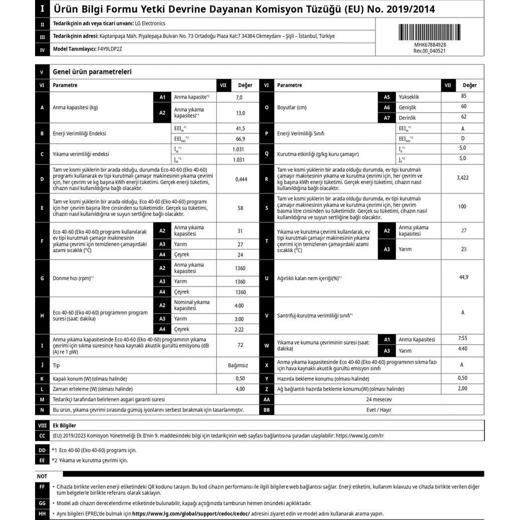 Bu ürün, F4Y9LDP2Z model numarasına sahip olan 13 kg yıkama ve 7 kg kurutma kapasitesine sahip bir çamaşır makinesidir. 1400 devir hızında çalışabilen bu makine, kurutma özelliği sayesinde çamaşırlarınızı yıkadıktan sonra kurutarak size zaman kazandırır. Ayrıca enerji verimliliği sağlayan özellikleriyle de dikkat çeker.