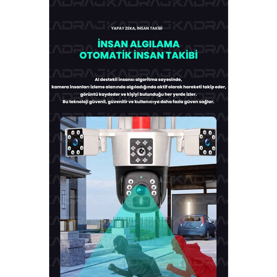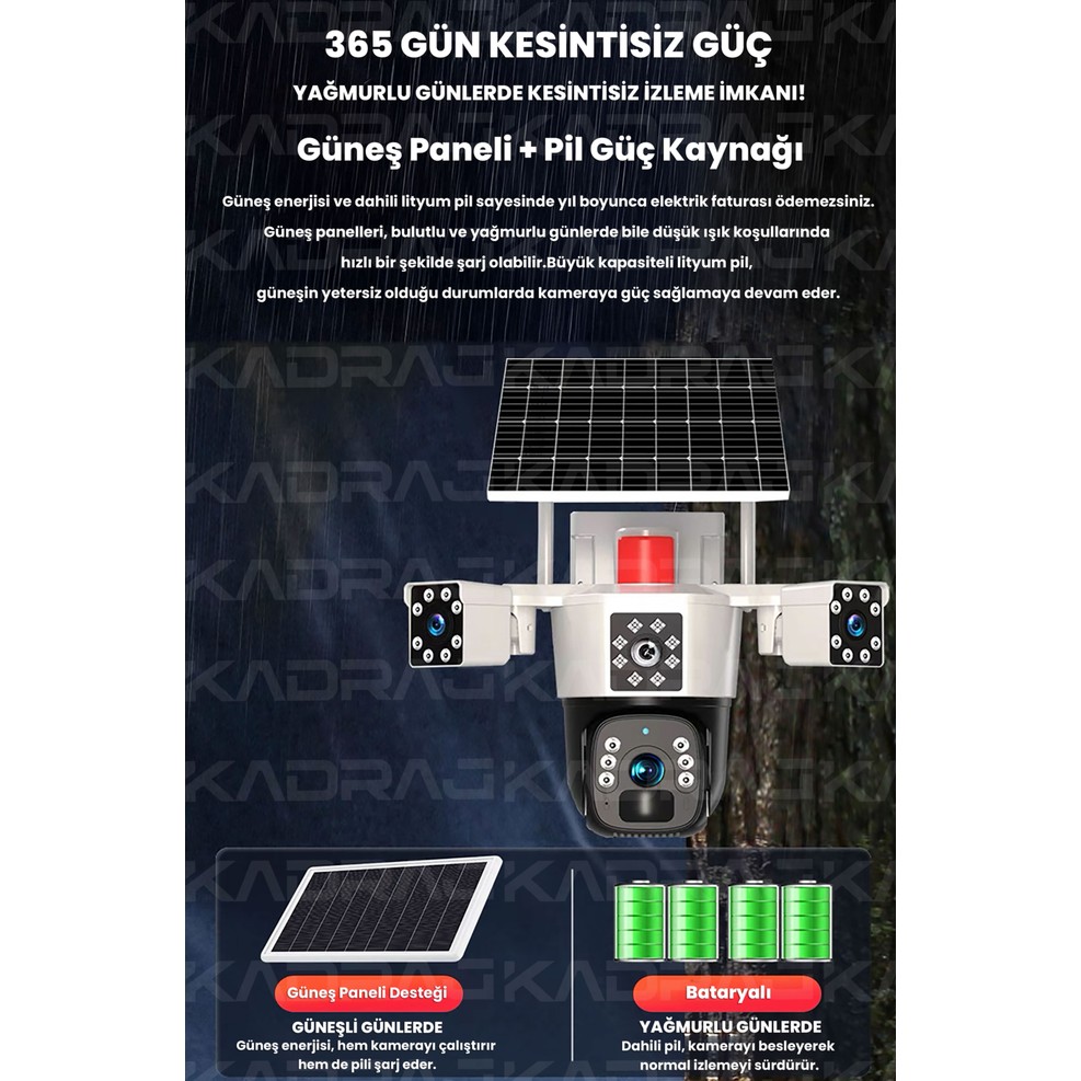Kadraj Solar Güvenlik Kamerası Güneş Panelli Çift Lensli 4g Sim Kart Destekli 10.000 Mah Batarya 6 mp Full Hd Görüntü Kalitesi