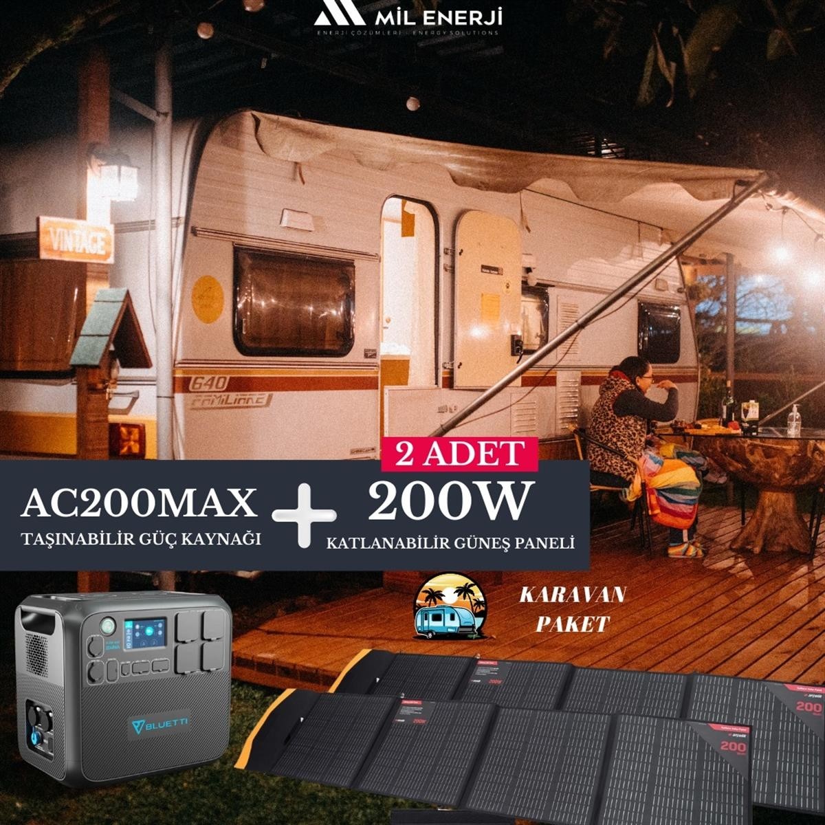 Karavan Enerji Paketi | Bluetti AC200MAX Taşınabilir Güç Kaynağı | 2x 200W Katlanabilir Güneş Paneli