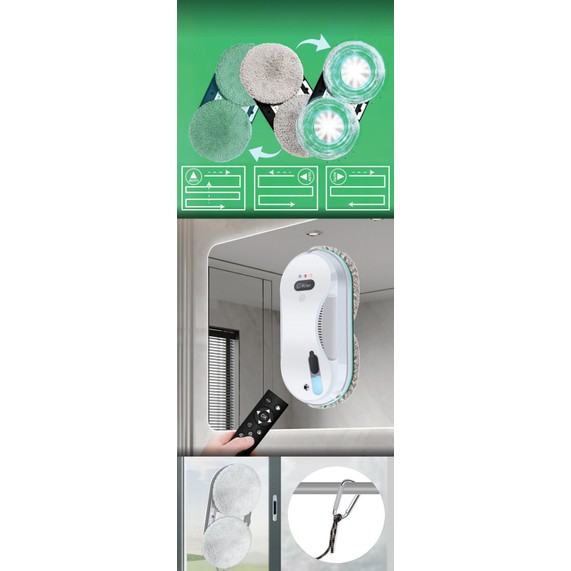 Paket içeriği: pencere temizleme robotu, uzaktan kumanda, güç adaptörü (4m kablo), temizleme pedi (8 adet), temizleme halkası (2 adet), emniyet halatı, kullanım kılavuzu, su şişesi, cam sileceği.