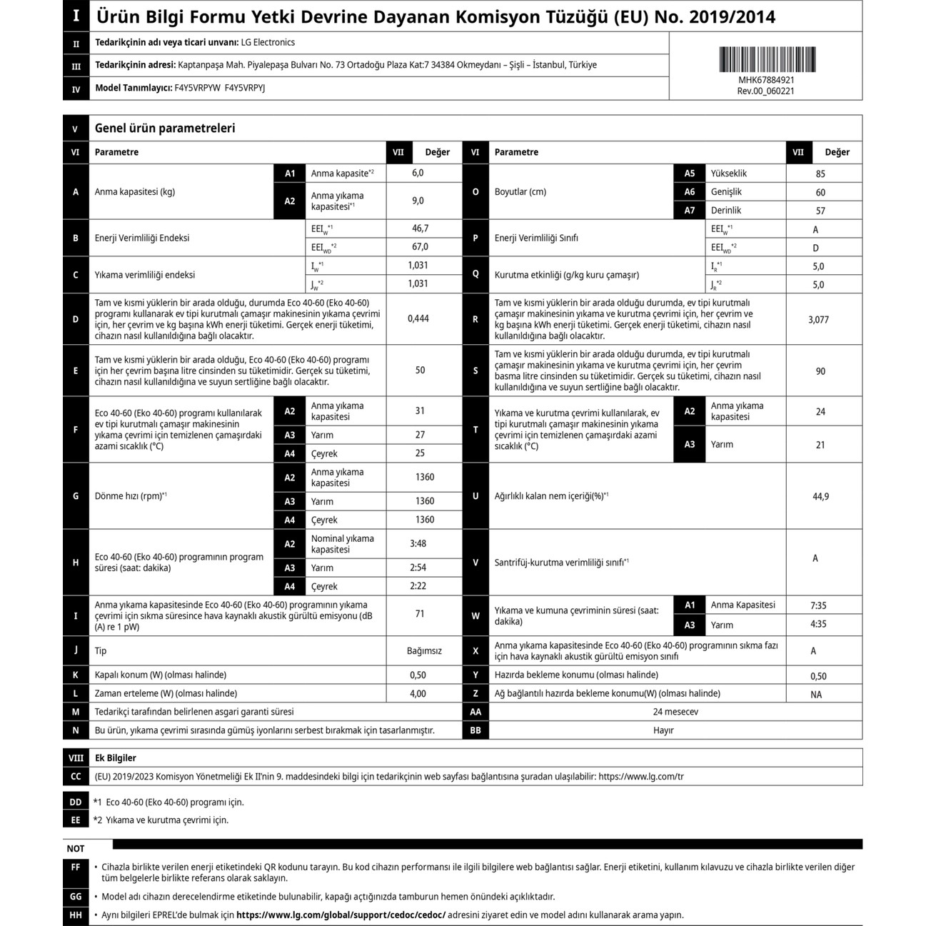 LG F4Y5VRPYW 9 kg Yıkama 6 kg 1400 Devir Kurutmalı Çamaşır Makinesi için 3 değerlendirme