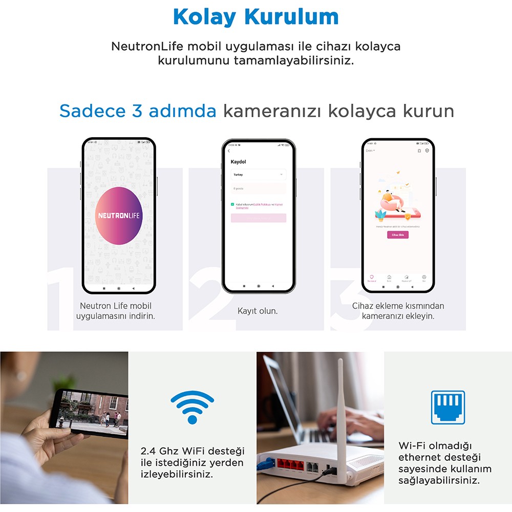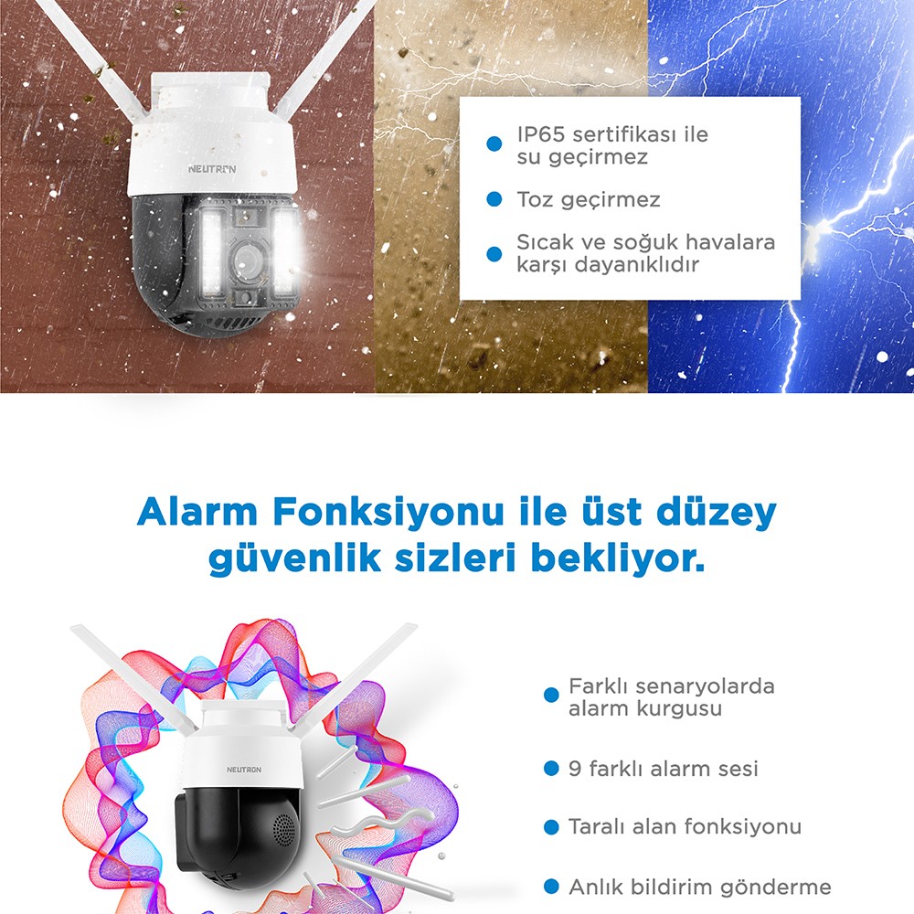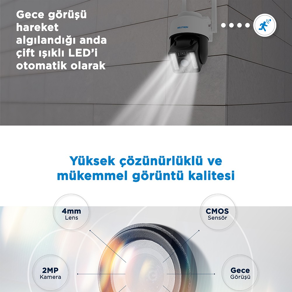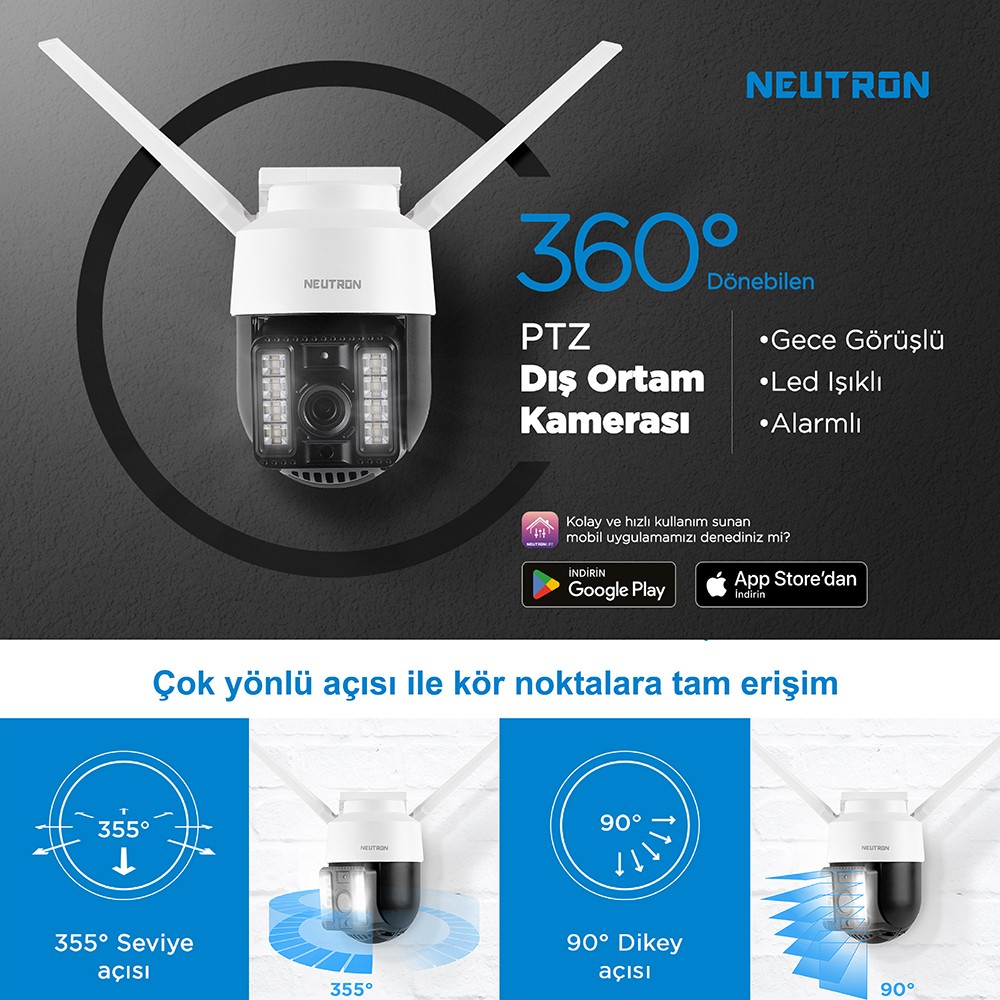 Neutron Gece Görüşlü LED Işıklı 360° Dönebilen Alarmlı Ptz Dış Ortam Kamerası, dış mekanlarda güvenlik sağlamak için tasarlanmış bir kamera sistemidir. Bu kamera, gece görüşü özelliği sayesinde karanlık ortamlarda da net görüntüler sağlar. Ayrıca 360 derece dönebilme özelliği sayesinde geniş bir alanı izleyebilir ve herhangi bir yöne hareket ettirebilirsiniz.