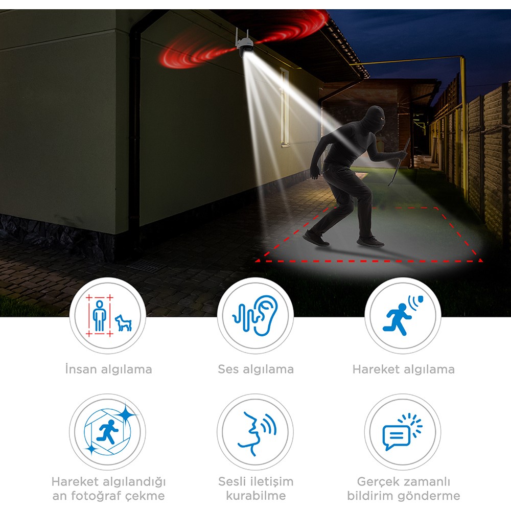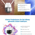 Kameranın üzerinde bulunan LED ışıklar sayesinde gece görüşü daha da iyileştirilir ve daha net görüntüler elde edilir. Ayrıca kamera üzerinde bulunan alarm özelliği sayesinde hareket algılandığında sizi uyarabilir ve potansiyel tehlikeleri önlemenize yardımcı olabilir.