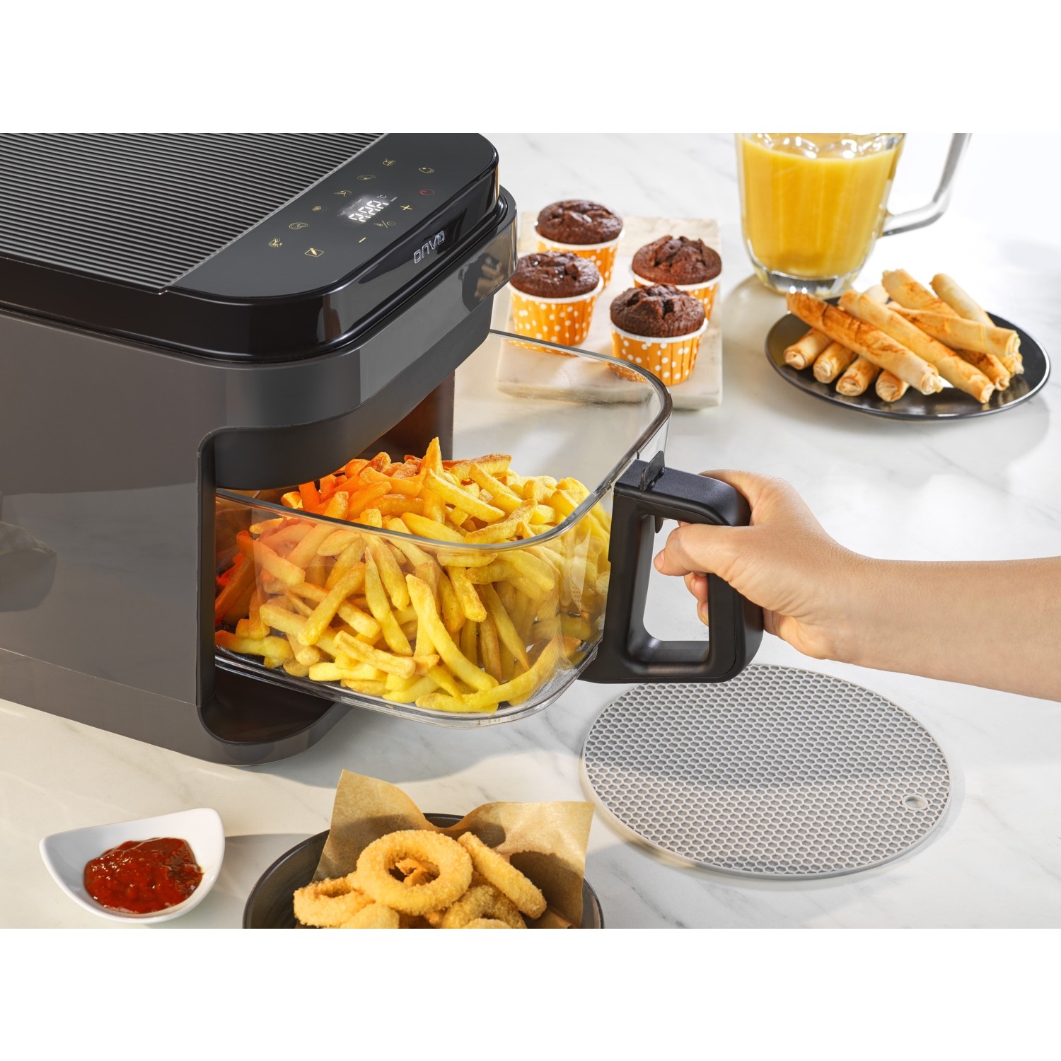 Onvo OVFRY10 Cam Air Fryer 5 Lt, modern tasarımı ile mutfakta şık bir görünüm sağlar ve kullanımı kolaydır. Temizliği de oldukça pratiktir. Sağlıklı ve lezzetli yemekler hazırlamak isteyenler için ideal bir seçenektir.