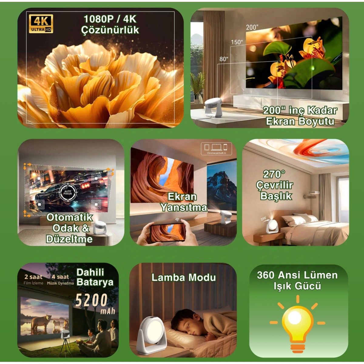 Robeve Mini Projektör | Android Tv Android Kurulu Full Hd Projeksiyon Projektör Wi-Fi ve Bluetooth Destekli | Sinema Keyfi | Taşınabilir ve Şık Tasarım 4K Projektör 4K Projeksiyon Cihazı