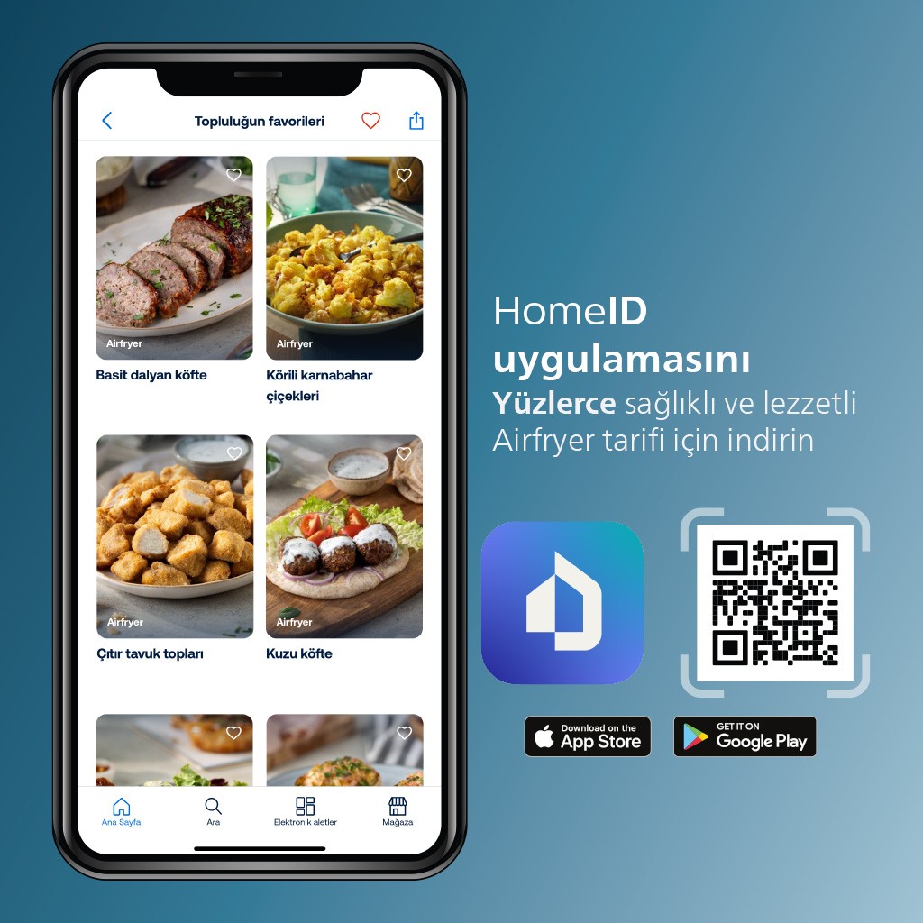 Ürün muhteşem kullanımı kolay temizliği kolay lezzetli ve saglıkli yemekler philips kalitesi telefonunuza homeid uygulamasını indirin çok güzel tarifler var kolay ve air fry inize uyumlu pişirme süreleri önerileri var ????