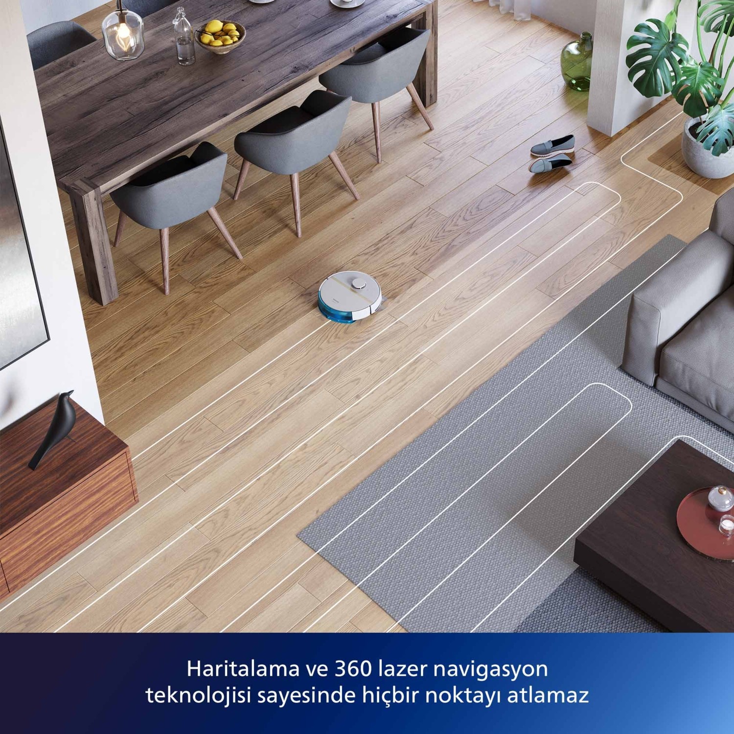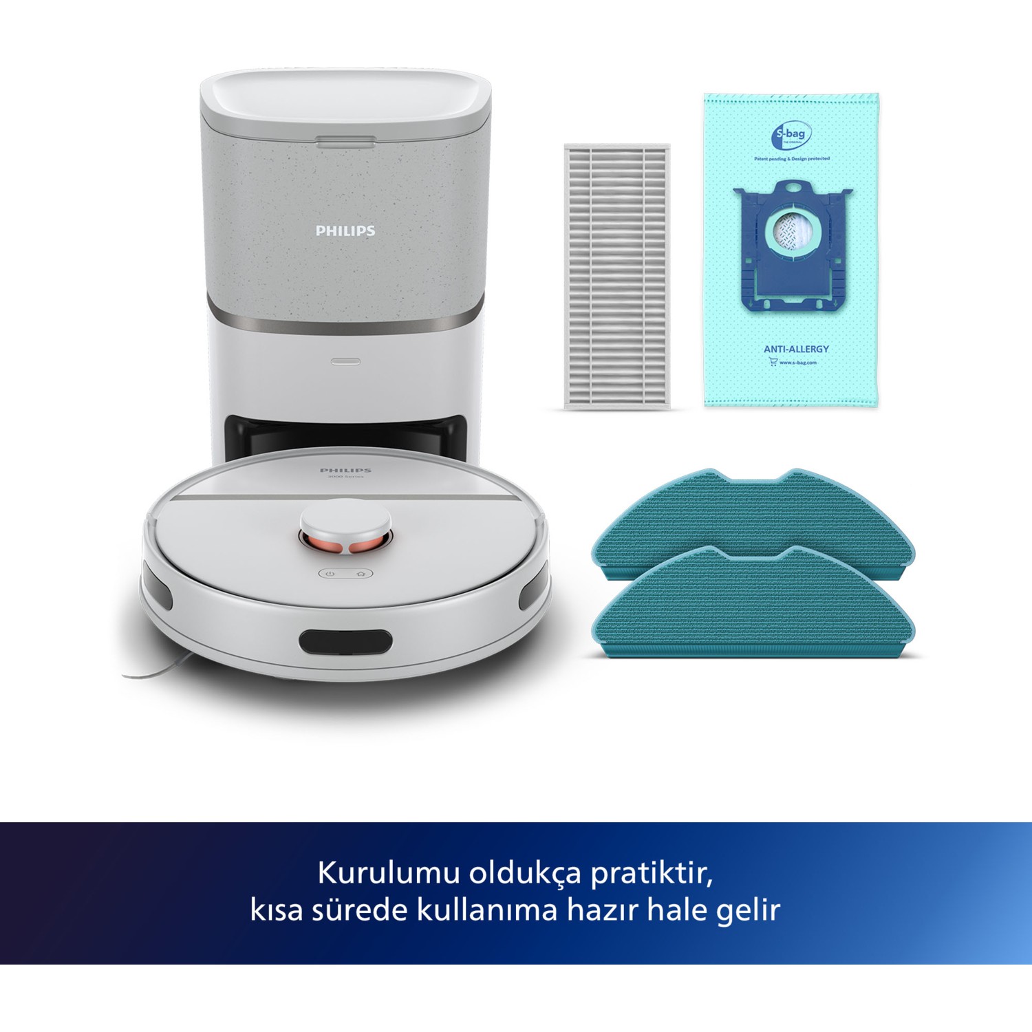 Philips 3100 Serisi HomeRun Aqua Islak Kuru Temizlik Robotu, evinizin zeminlerini temizlemek için tasarlanmış bir robot süpürgedir. Otomatik Boşaltma İstasyonu sayesinde, robotun topladığı kir ve tozları kolayca boşaltabilirsiniz. HomeRun özelliği sayesinde, temizlik programlarınızı kolayca planlayabilir ve kontrol edebilirsiniz. Açık renkli şık tasarımıyla da evinizin dekorasyonuna uyum sağlar.