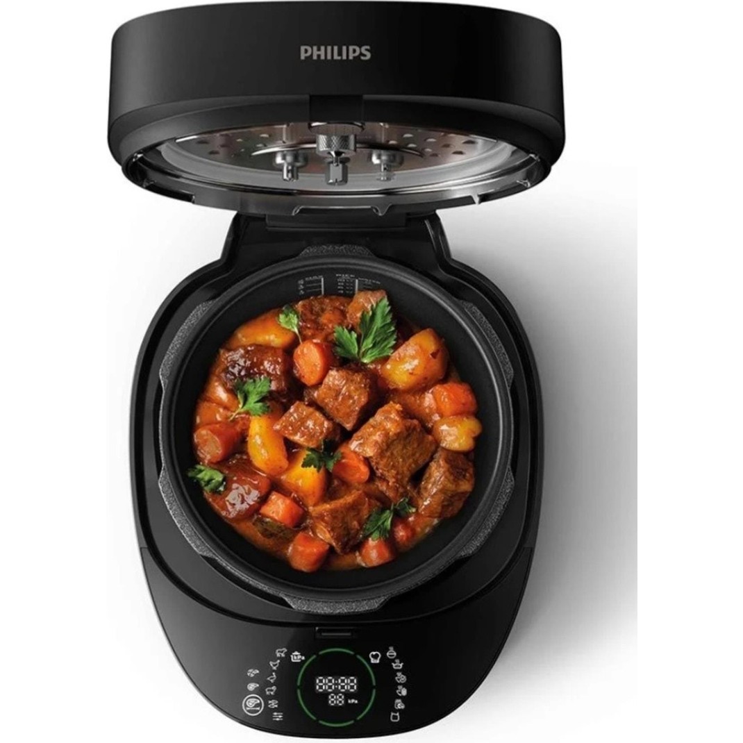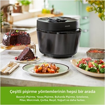 Philips HD2151/62 All in One Cooker, çok yönlü bir mutfak aletidir. Bu ürün, yemek pişirmek için farklı fonksiyonlara sahip bir tencere olarak kullanılabilir. Basınçlı pişirme, yavaş pişirme, buharda pişirme, kızartma, ızgara ve daha birçok işlemi tek bir cihazda gerçekleştirebilirsiniz.