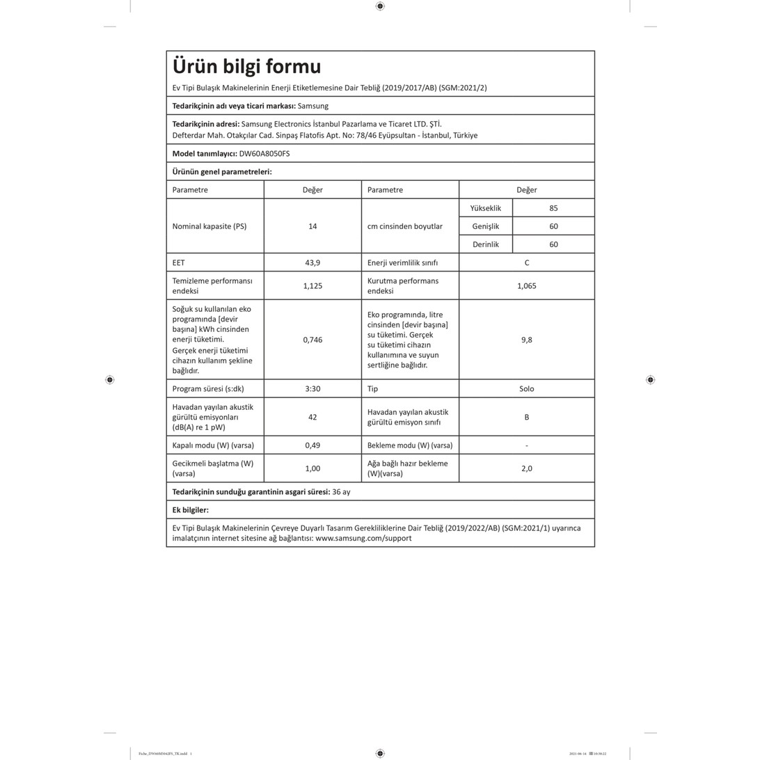 Samsung DW60A8050FS 8 Programlı Bulaşık Makinesi