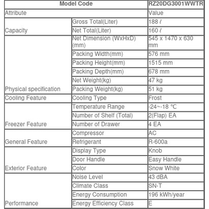 Samsung RZ20DG3001WWTR, 43 dB ses seviyesiyle sessiz çalışır, böylece evinizin huzurunu bozmadan işlevini yerine getirir. 4 çekmeceli yapısı, gıdalarınızı düzenli bir şekilde saklamanıza olanak tanır. Yıllık 196 kWh enerji tüketimi ile yüksek performans ve verimliliği bir arada sunar.