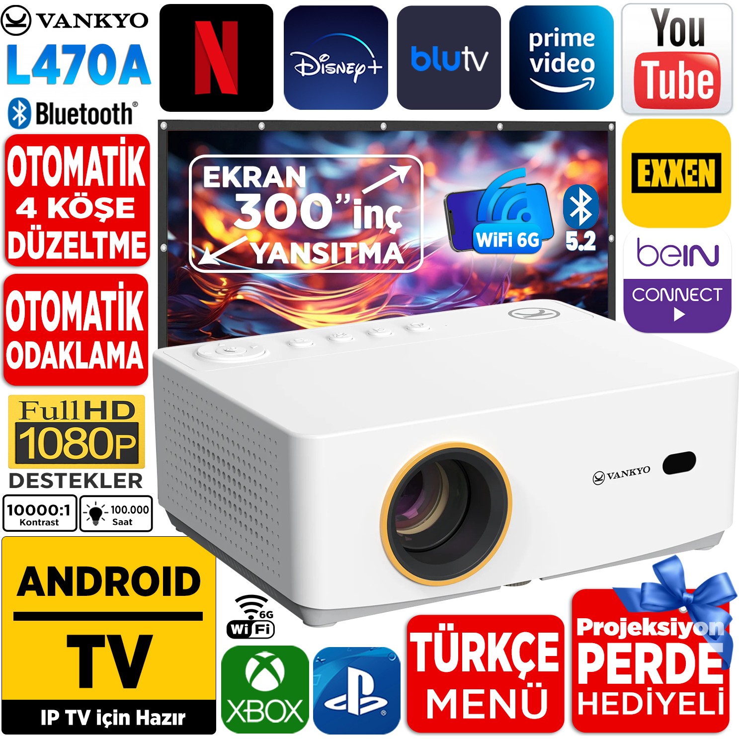 Vankyo Leisure L470A Android Tv 1080P Destekli Projeksiyon Cihazı +Auto Focus+Auto Keystone+6g Wifi+5.2 BLUETOOTH+300 Inç Yansıtma+Hifi Premium Ses Sistemi Beyaz Ps5/xbox/hdmı