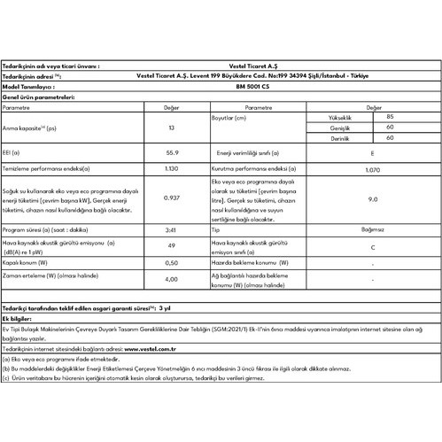 Vestel BM 5001 CS 5 Programlı Bulaşık Makinesi