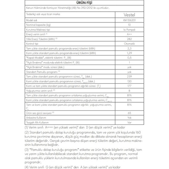 Vestel KM 106201 10 kg Kurutma Makinesi