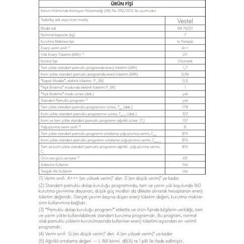 Vestel KM 76201 7 kg Kurutma Makinesi için 7 değerlendirme