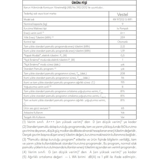 Vestel KM 97202 G WIFI 9 kg Kurutma Makinesi için 2 değerlendirme