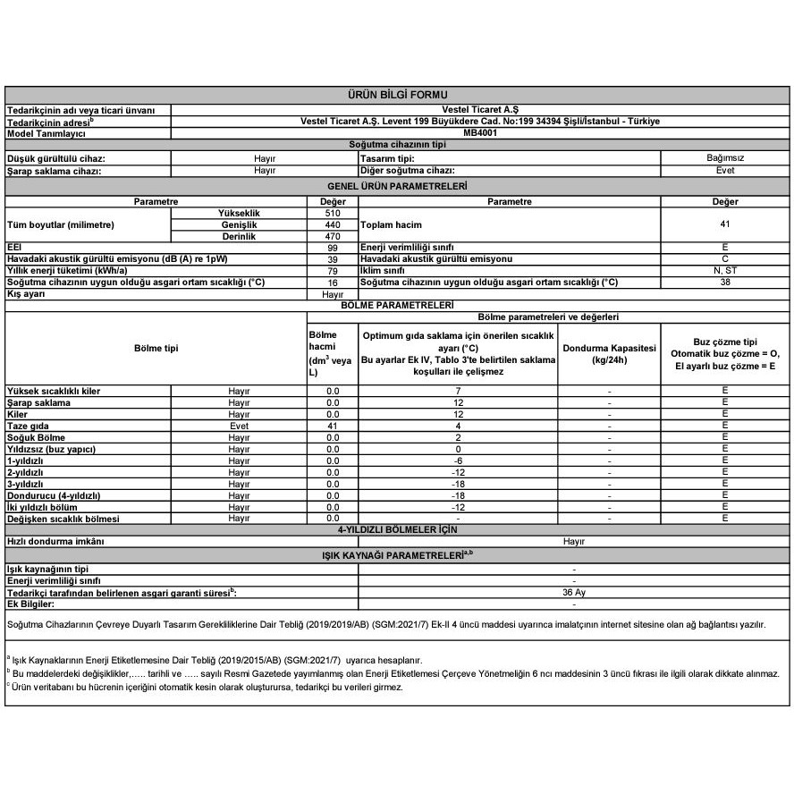 Vestel MB4001 E Enerji Sınıfı 41 Ly Minibar Mini Buzdolabı