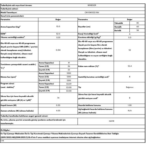 Windsor CM 10WS122 Inv 10 kg 1200 Devir Inverter Çamaşır Makinesi
