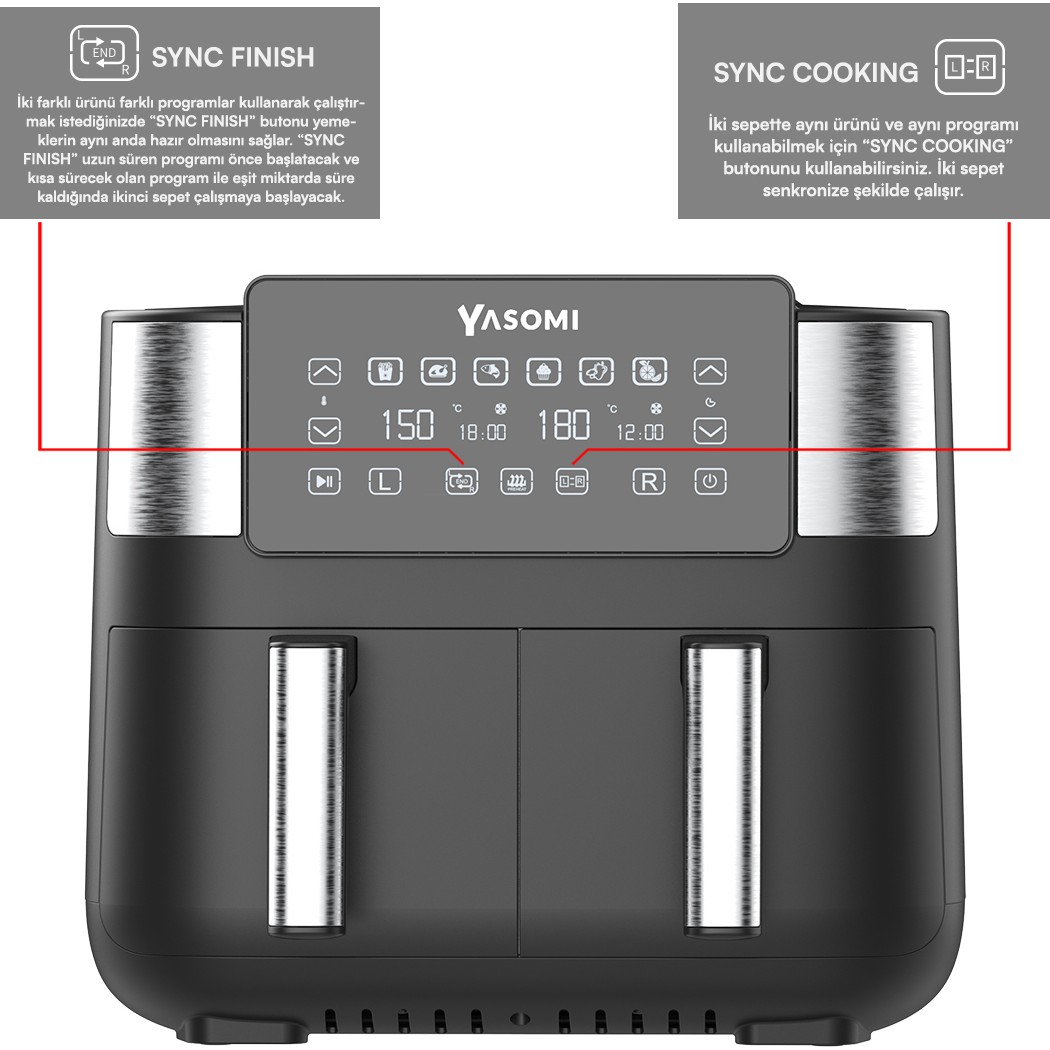 Yasomi Y80 Siyah 8 Litre 2850W Çift Hazneli ve Çift Motorlu Dokunmatik Airfryer Fritöz
