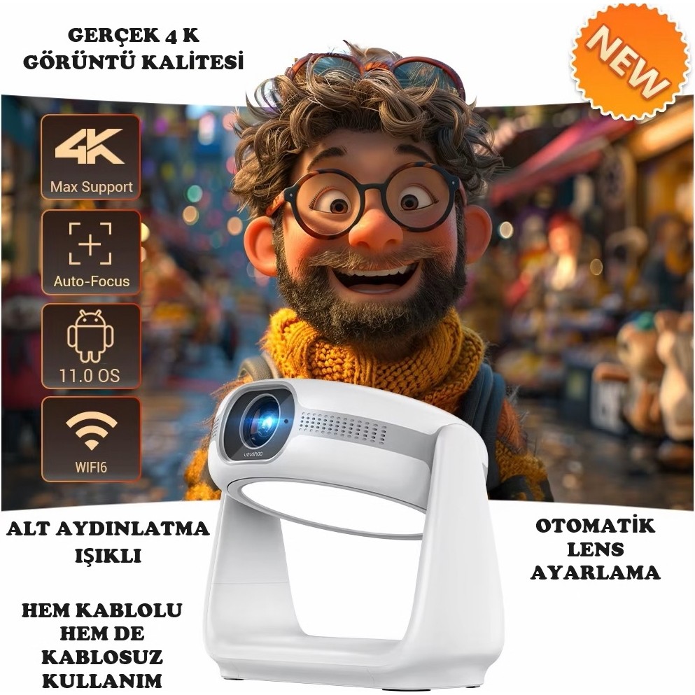 Vankyo Aurzen Boom 3 4K Android Projeksiyon Cihazı + Auto Focus + Auto Keystone + 6g Wifi + 5.2 Bluetooth +300 Inç Yansıtma + 36W Hifi Dolby Ses Sistemi